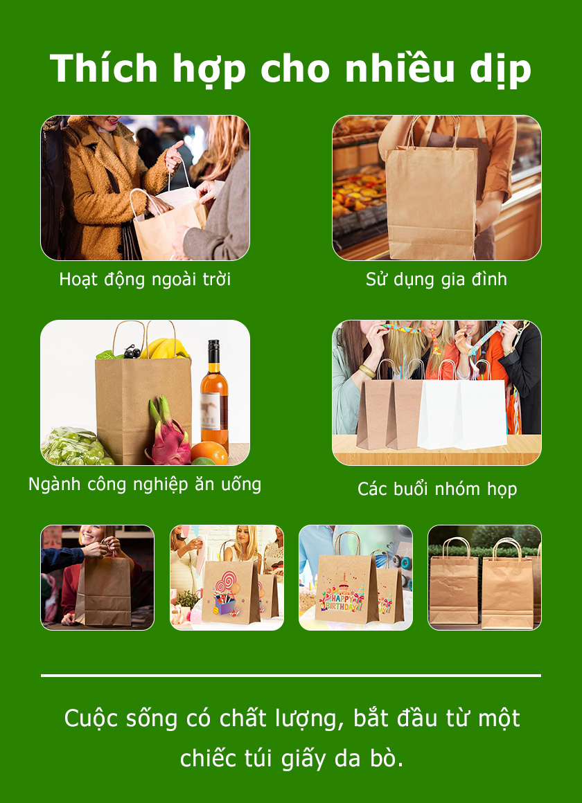 3. Đa dạng mục đích sử dụng: Phù hợp để đựng quà tặng, sản phẩm thời trang, đồ mỹ phẩm hoặc sử dụng trong các cửa hàng, sự kiện. Túi có thể in ấn logo hoặc họa tiết theo yêu cầu.