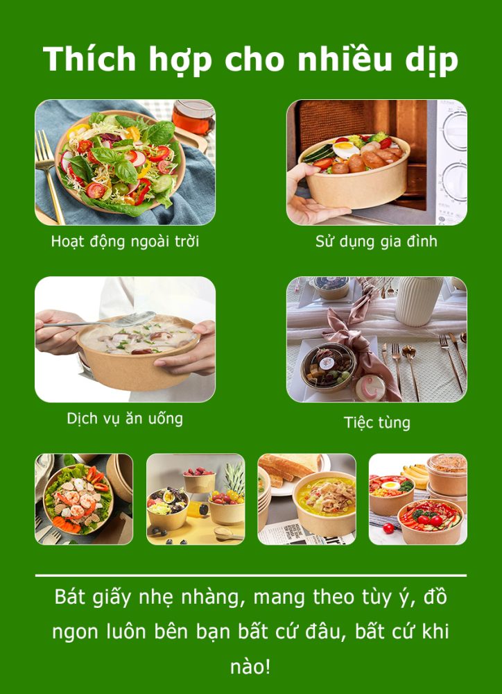 Tô giấy Kraft 32OZ là sản phẩm có dung tích lớn nhất trong phân khúc, đáp ứng nhu cầu đặc biệt của các nhà hàng, quán ăn. Với thiết kế thành dày 4 lớp giấy, tô có thể chịu được trọng lượng lớn mà không bị biến dạng. Sản phẩm đặc biệt phù hợp cho các món lẩu mini, canh nóng hoặc phần ăn đặc biệt. Chúng tôi cung cấp với giá sỉ ưu đãi cho các đơn hàng số lượng lớn từ 2000 sản phẩm trở lên, đảm bảo chất lượng đồng đều và giao hàng đúng hẹn.